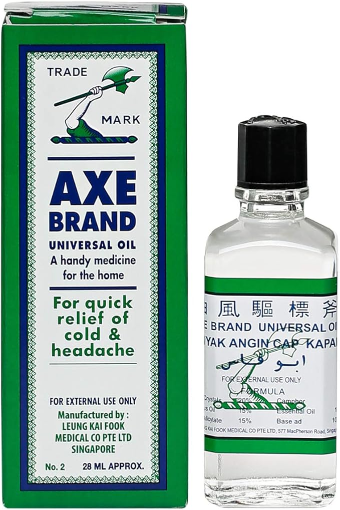 Axe Brand Universal Oil is a classic medicated oil trusted for generations to provide fast relief from common ailments such as headaches, colds, nasal congestion, muscle aches, stomach discomfort, and insect bites. Its refreshing and soothing blend of natural oils makes it a versatile must-have for every household.
