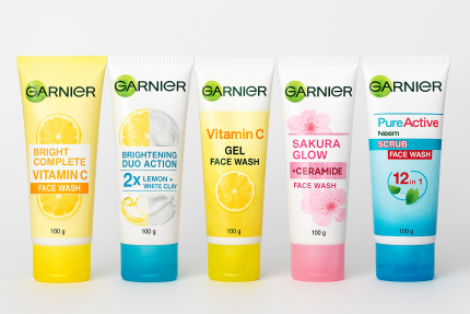 A collection of five Garnier face washes, each tailored to different skin needs: