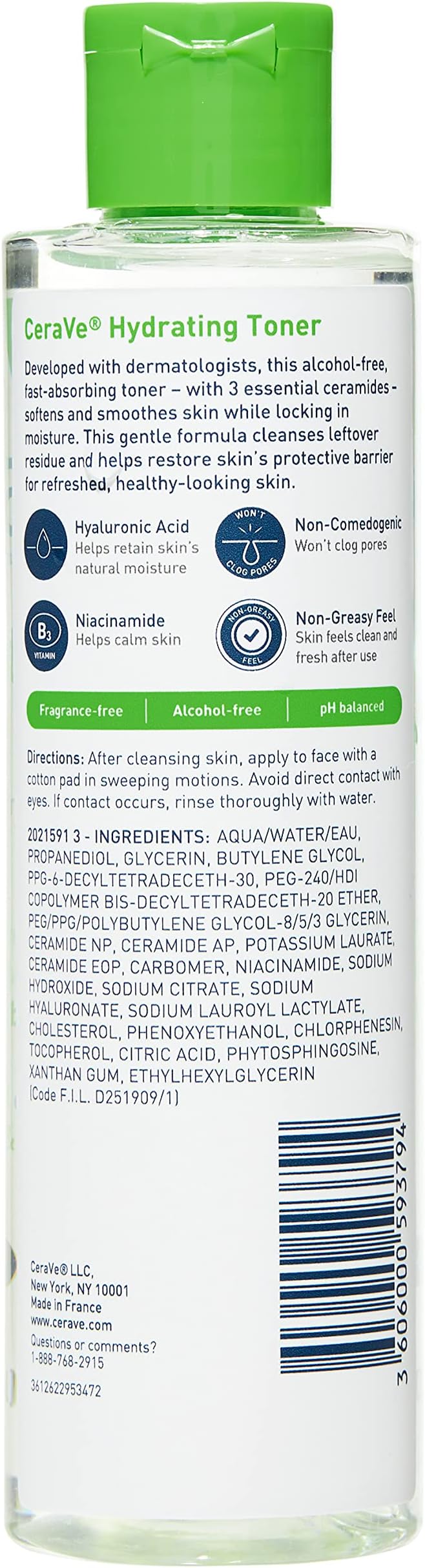 CeraVe Hydrating Toner for Face Non-Alcoholic with Hyaluronic Acid, Niacinamide, and Ceramides for Sensitive Dry Skin, Fragrance-Free Non Comedogenic, Full Size, 6.80 Ounce (Pack of 1)