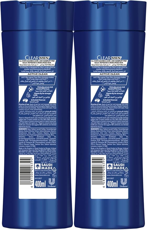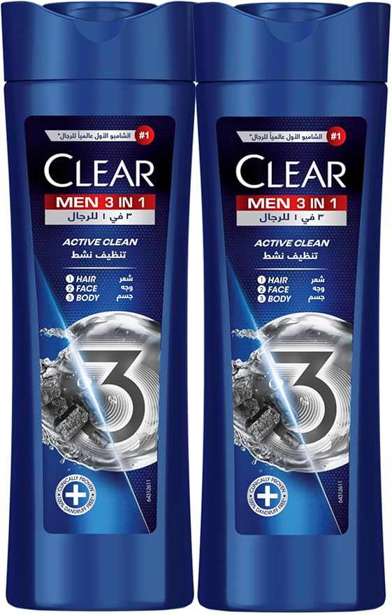 Clear Men Complete Care 3in1 Shampoo For Hair, Face & Body With Activated Charcoal for 100% dandruff free hair and moisturized skin, 400ml Pack of 2, white