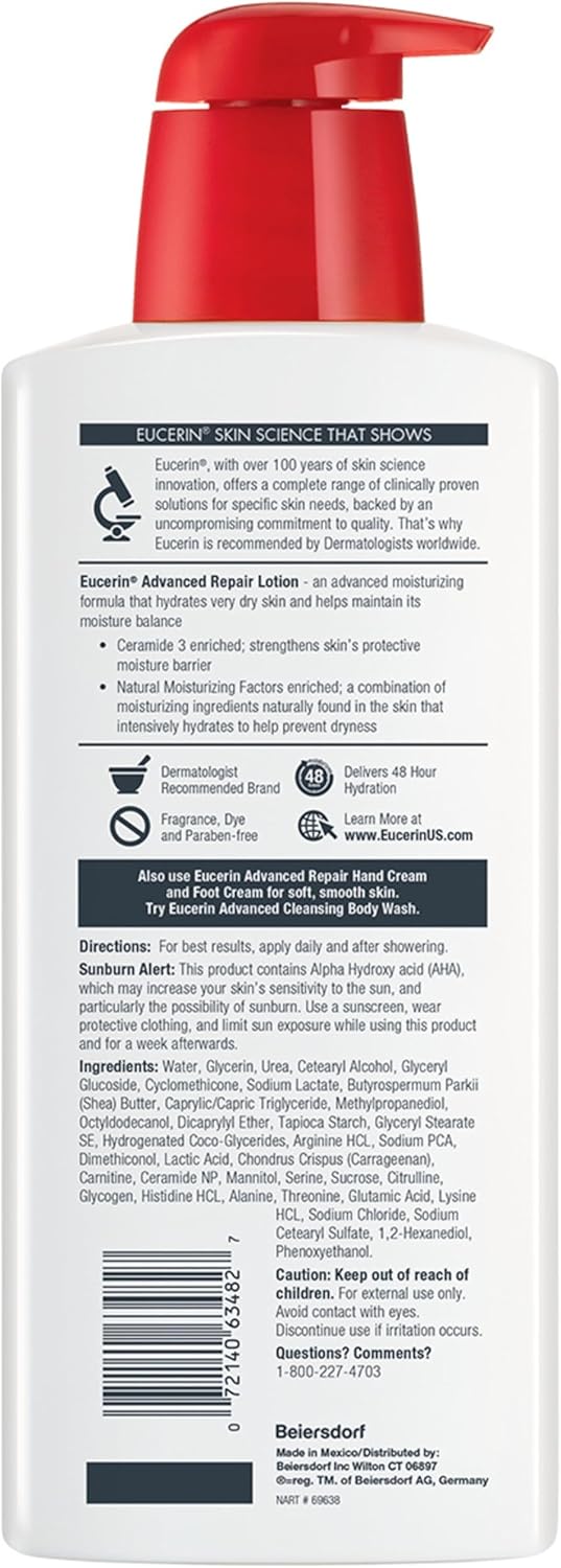 • Includes one 500 ml bottle of Eucerin Advanced Repair Body Lotion, unscented, designed for dry and sensitive skin.