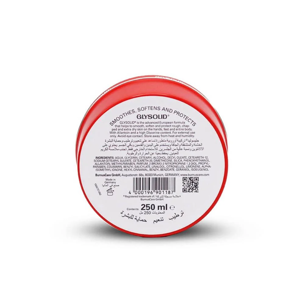 Glysolid Body Moisturizing Cream is an advanced formula enriched with high glycerin and skin-loving ingredients. It soothes, nourishes, and protects dry, rough, or cracked skin, delivering deep hydration with a non-greasy texture that absorbs quickly—ideal for everyday use on all skin types.