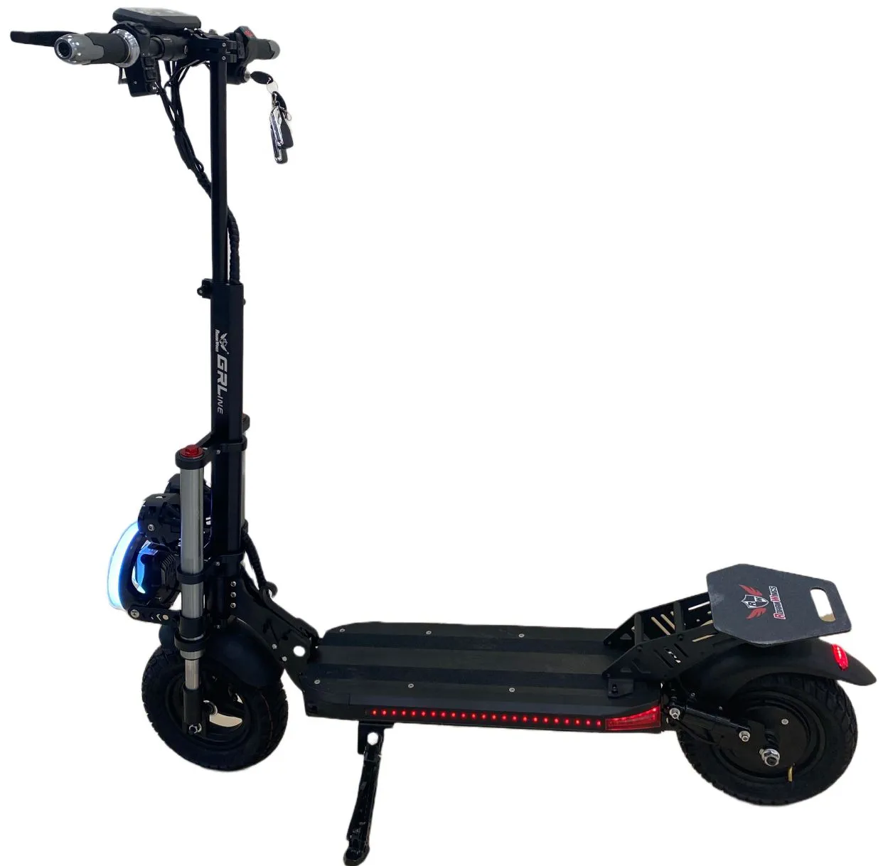 The GRL-S3-PLUS is designed for peak performance with a 2000W motor and a 48V 18Ah LT battery, offering a top speed of 54 km/h and a 32 km range. It features 11.5-inch off-road/city tires for superior traction, and a full light system to ensure visibility and safety during rides.