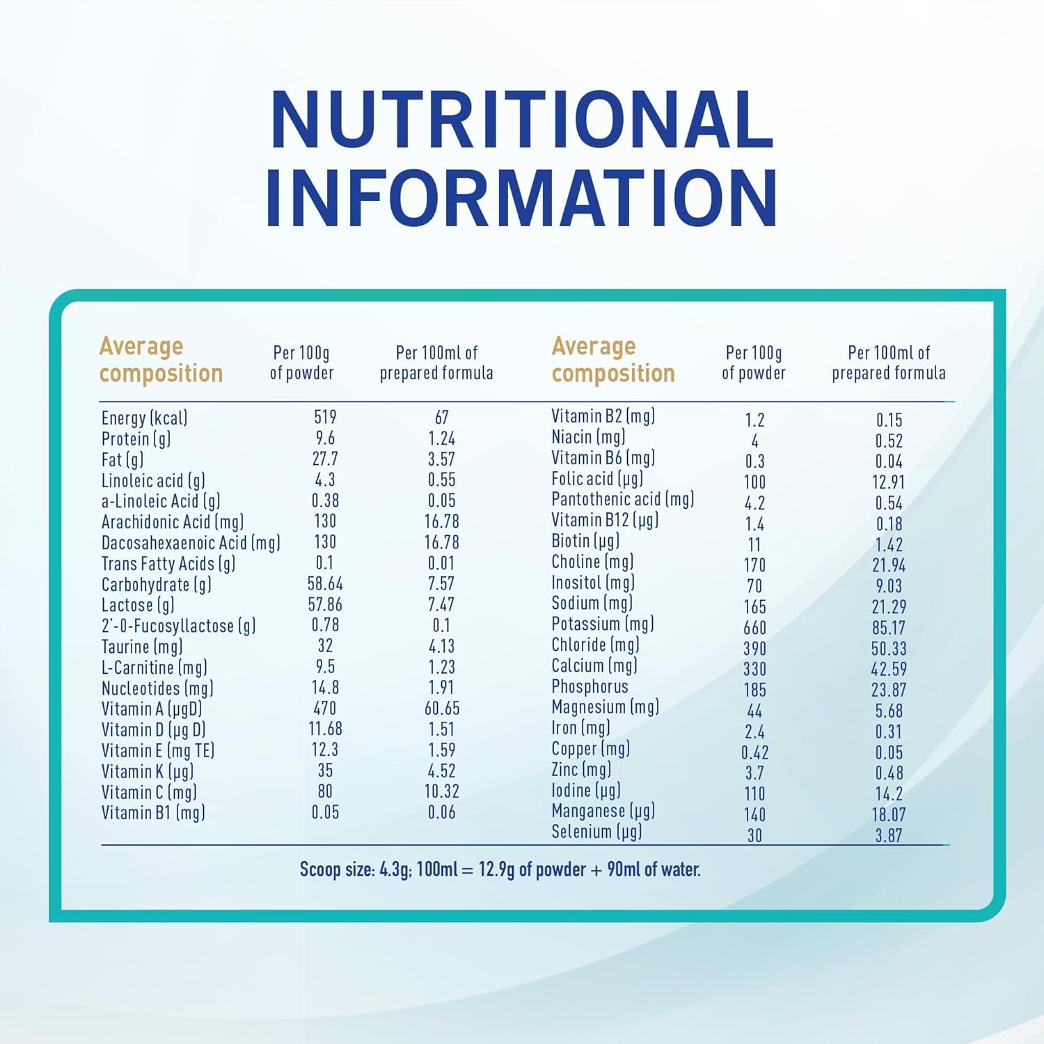 Ingredients: Full cream cow’s milk powder, whey powder, corn fiber, vitamins and minerals, soy lecithin (emulsifier).