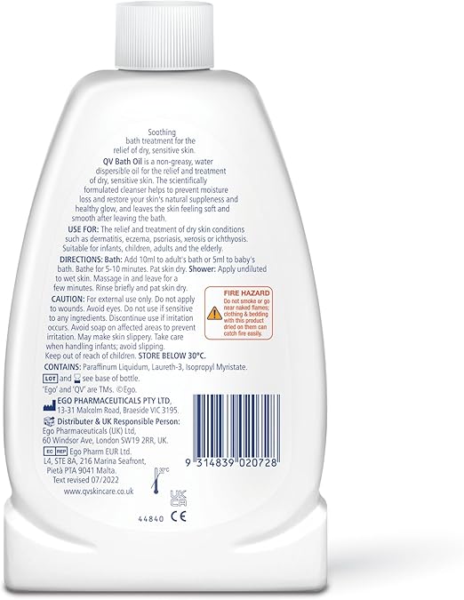 QV Bath Oil 500 ml is a gentle, fragrance-free bath oil formulated to help manage dry and sensitive skin. Dermatologically tested and free from colourants, lanolin, and other irritants, it provides therapeutic relief while keeping the skin soft and hydrated. Suitable for all ages, this vegan-friendly, cruelty-free bath oil can be added to bath water for daily skin conditioning and comfort.
