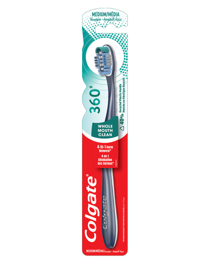A manual toothbrush with charcoal-infused medium bristles that help remove plaque and fight odor. Its V-shaped bristles clean between teeth and along the gumline, while the built-in tongue cleaner freshens breath. The ergonomic handle ensures a comfortable grip for everyday use.