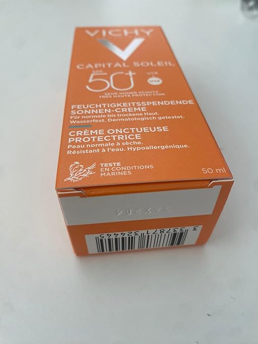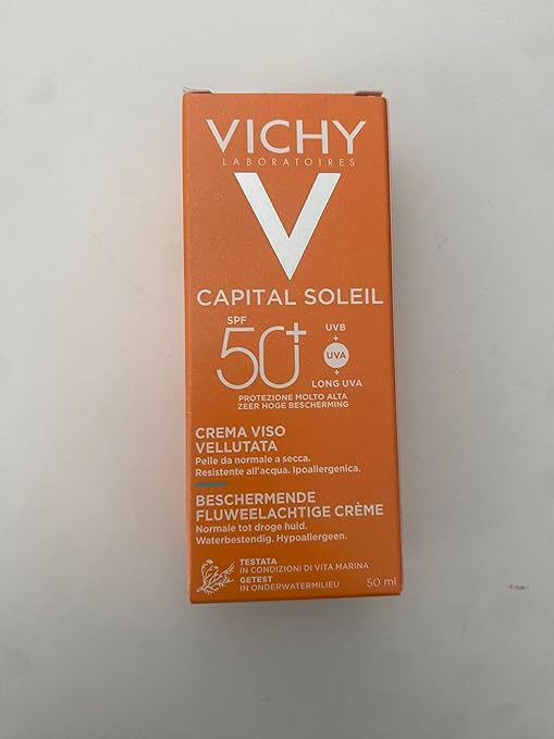 Vichy Ideal Soleil Velvety Cream SPF50+ offers high protection against UVA and UVB rays, making it suitable for normal to dry skin types. Its creamy texture, enriched with Vichy Thermal Spa Water and Hyaluronic Acid, provides hydration while helping to prevent premature skin aging. The formula is paraben-free and has been tested under dermatological control.